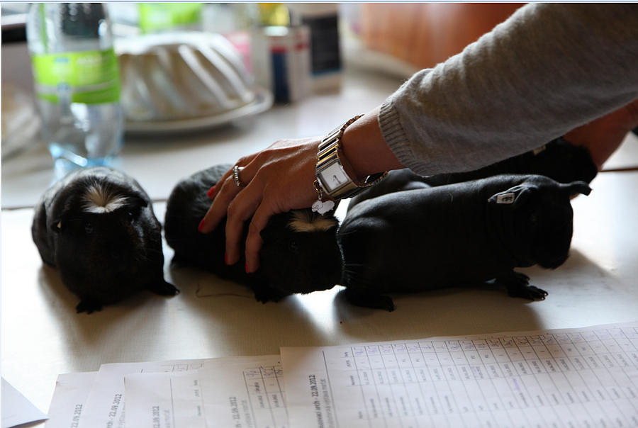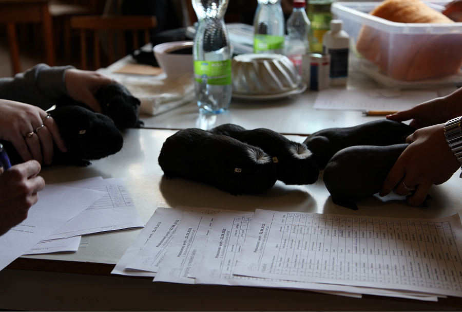 1. Nejlepší chovná skupina výstavy - Helga Cavia Bohemia + Padmé Naberrie Cavia Bohemia + Jamaika Cavia Bohemia + Darth Revan Cavia Bohemia, 387 b. (maj. Denisa Vítková); morčata v plemeni Americký crested, v barvě černá