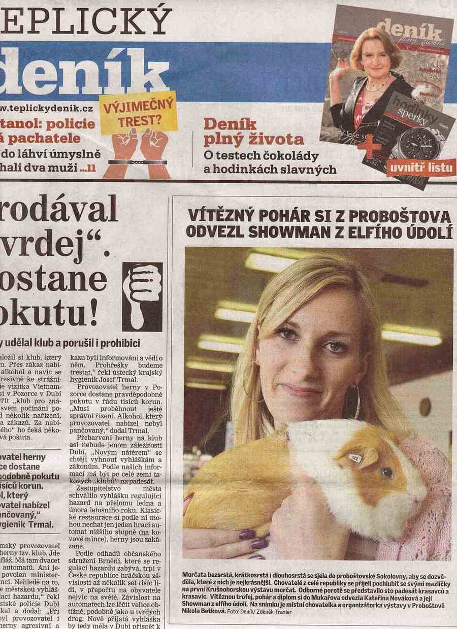 Po dlouhodobém zvažování zda uspořádat vlastní výstavu morčat, jsem se k tomuto kroku odhodlala a pomalu jsem začala zveřejňovat, kdy, kde a jak ji uspořádám. Vzhledem k tomu, že bydlíme v obci pod Krušnými horami, dala jsem jí i příznačný název Krušnohorská. Teď zbývalo nalézt prostory, kde se výstava bude konat a vymyslet příhodné datum. V obci se 22. září konaly každoroční slavnosti obce, což bylo pro mě to správné datum a já očekávala velkou návštěvnost i ze strany veřejnosti. Vše klaplo dle mých představ a Krušnohorská výstava mohla začít. V systému bylo přihlášeno 164 morčat všech plemen a standardů A, B i C, z řad veřejnosti nás navštívilo zhruba 400 lidí.