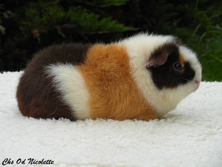 Na fotografii jde vidět rozdíl ve vybarvení bříška u již zmiňovaných morčat v čokoládové-buff-bílé. I přesto, že jsou obě morčátka ve stejné barevné kombinaci rozdíl v čokoládové je velmi patrný.